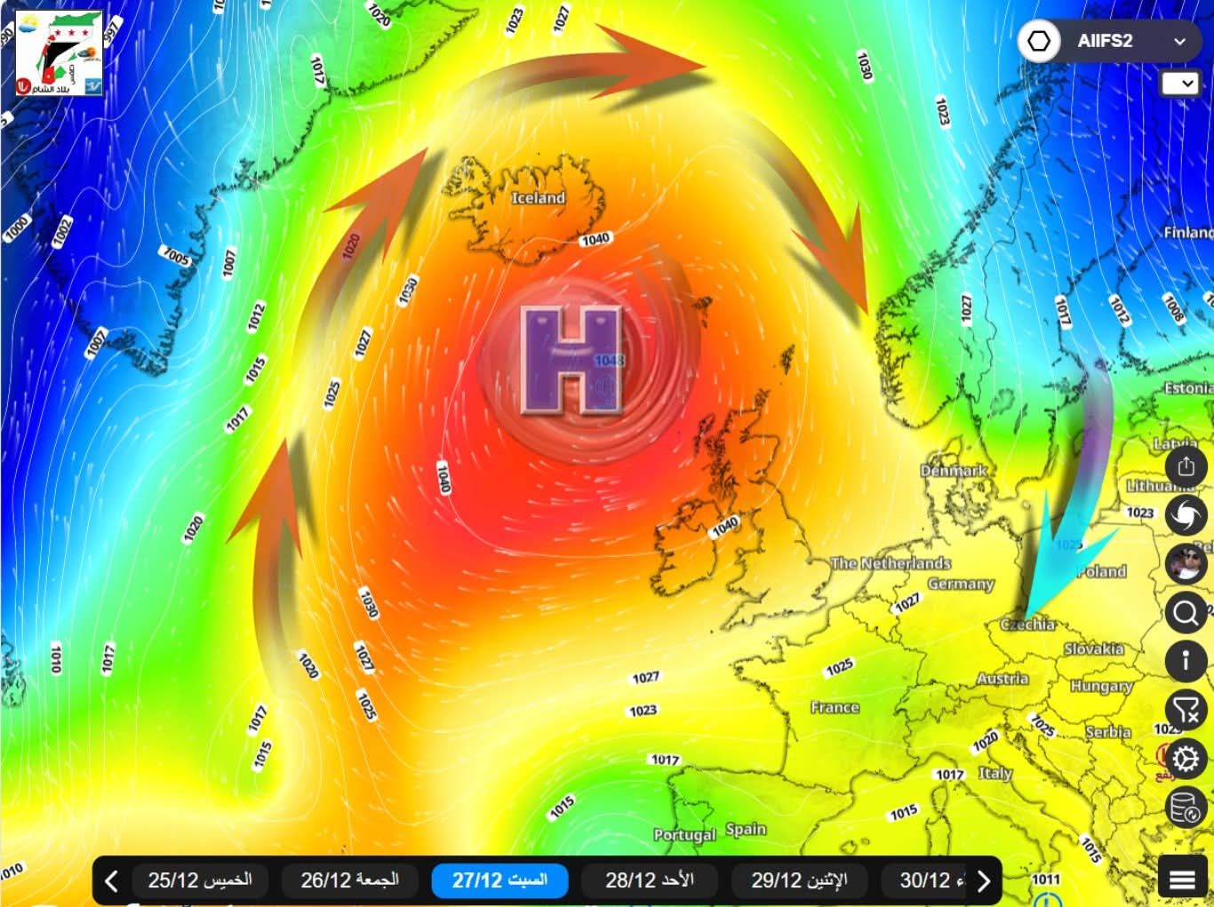 تتفق مُعظم المراكز العالمية والمُدارة بواسطة تقنيات #الذكاء_الاصطناعي على احتمالية تطور نظام من الضغط الجوي المُرتفع فوق الجزر البريطانية، يمتد شمالاً حتى آيسلاندا ويصل الى قلب القطب الشمالي.