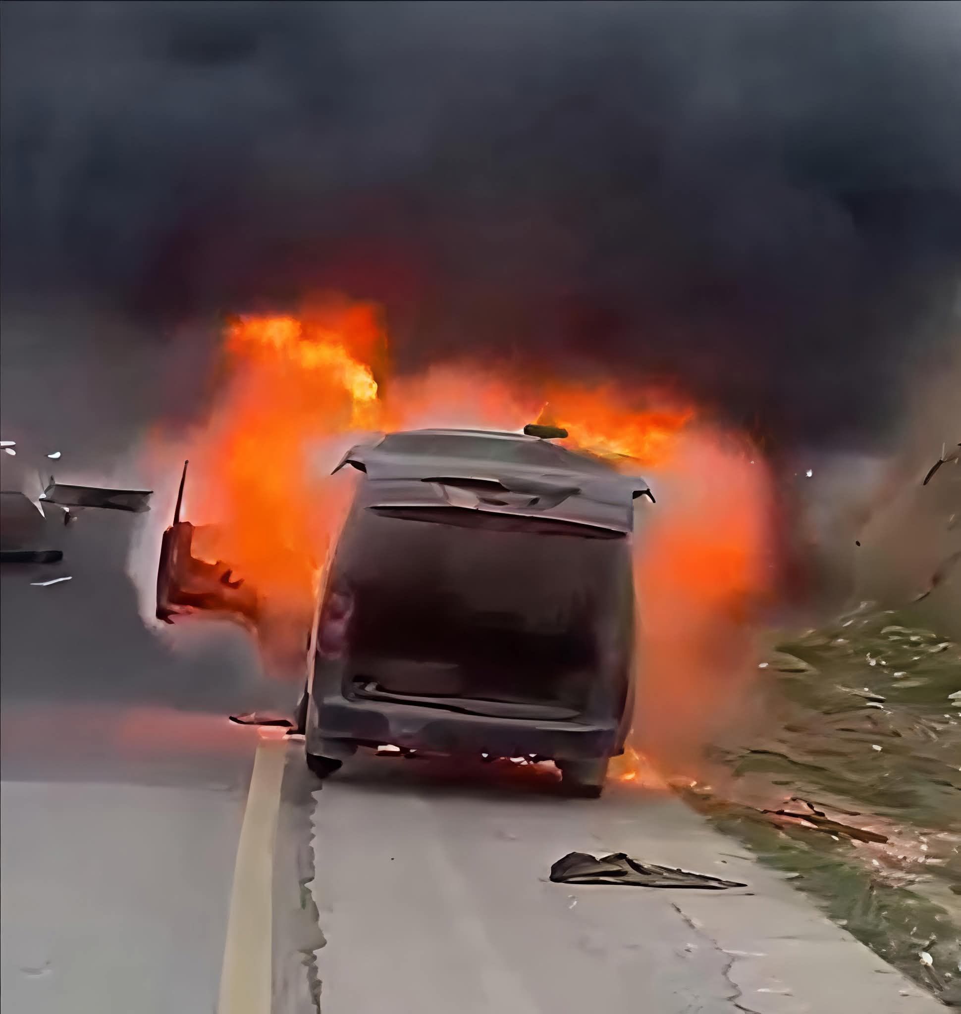 البلقاء اليوم - أحتراق باص صغير على جسر مرصع طريق عمان / إربد.