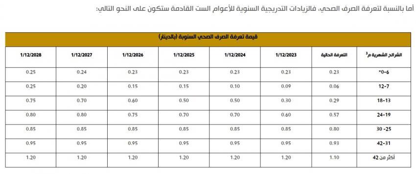 وبموجب هذه المرحلة، ارتفعت التعرفة المقطوعة للمياه على الشريحة الأولى، التي لا يتجاوز استهلاكها الشهري 6 أمتار مكعبة، لتصل إلى 2.5 دينار، بزيادة مقدارها 25 قرشًا. كما جرى رفع التعرفة بمقدار 5 قروش للمتر المكعب على الشريحة الثانية التي يتراوح استهلاكها بين 7 و12 مترًا مكعبًا شهريًا.