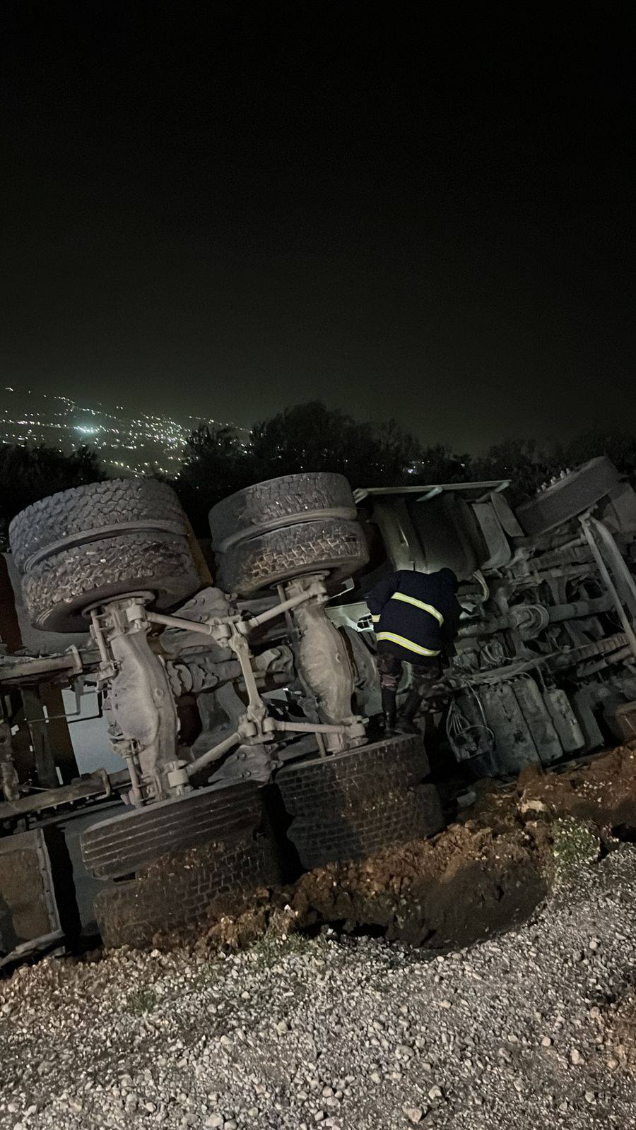 البلقاء اليوم - انقلاب خلاط اسمنت في منطقة علان طريق الخفنة..