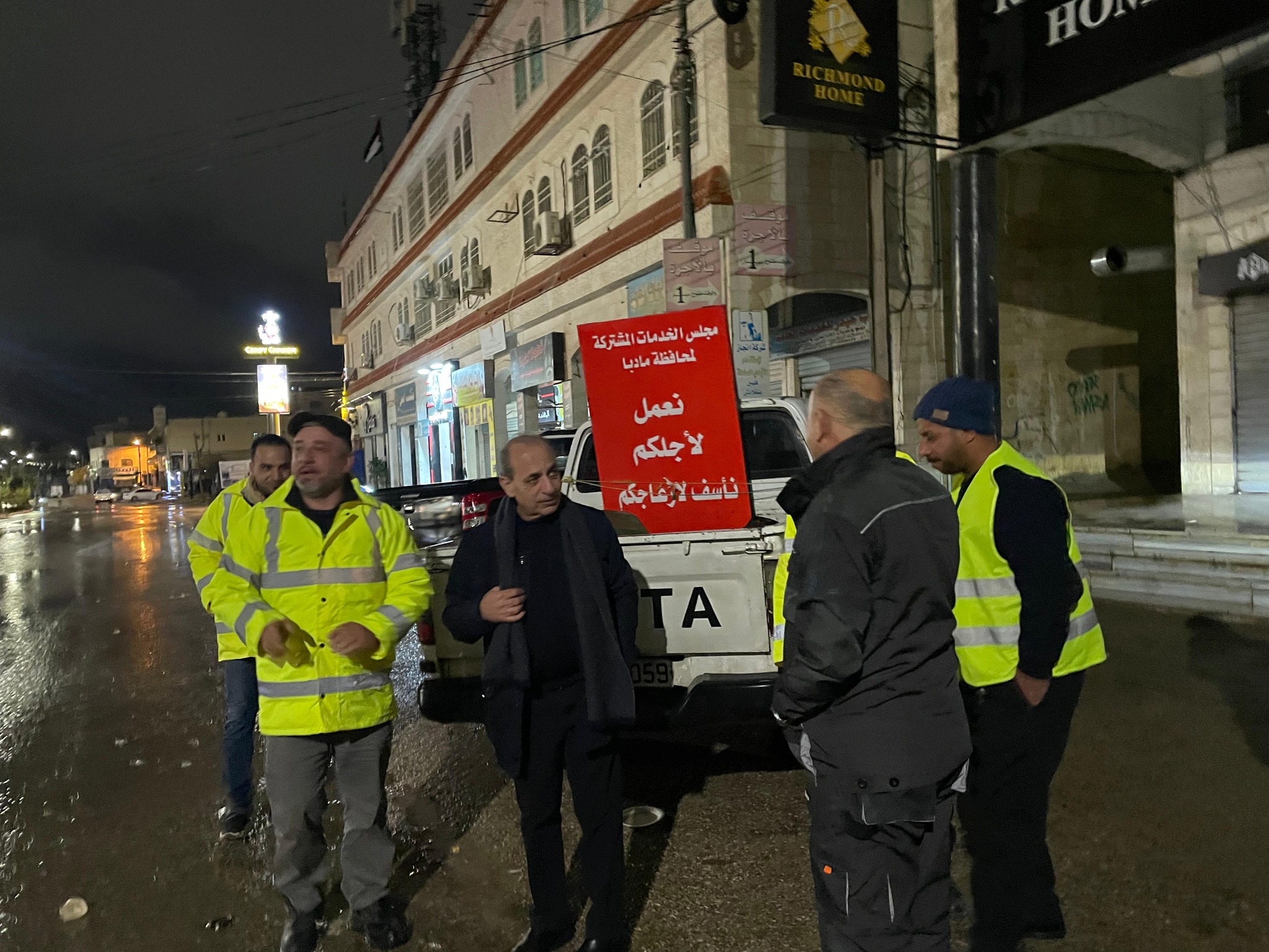 وفي محافظة مادبا، تفقد الوزير مناطق بلدية مادبا، واطلع على غرفة الطوارئ فيها، وتفقد غرفة الطوارئ في مجلس الخدمات المشتركة، حيث استمع إلى إيجاز من الكوادر المعنية ورئيس مجلس الخدمات المشتركة في مادبا حول الإجراءات التي اتخذتها البلدية والمجلس ومديرية الشؤون البلدية إستعدادا للحالة الجوية السائدة.