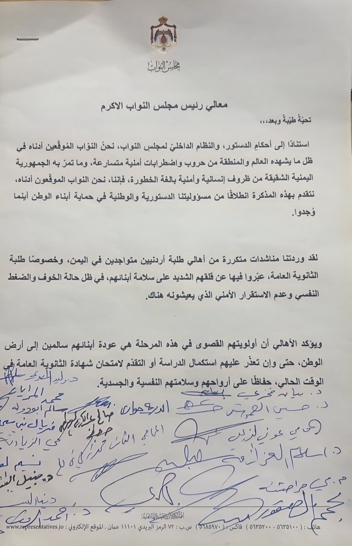 البلقاء اليوم - نواب يطالبون الحكومة بالتحرك العاجل لإعادة الطلبة الأردنيين من اليمن.. دعوة لإعطاء أولوية لطلبة التوجيهي وضمان مستقبلهم التعليمي بعد عودتهم في ظل الظروف الأمنية الخطيرة هناك