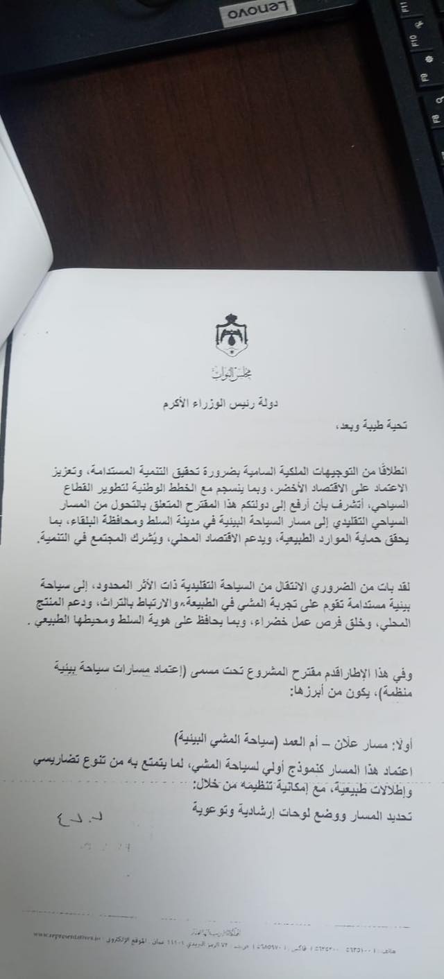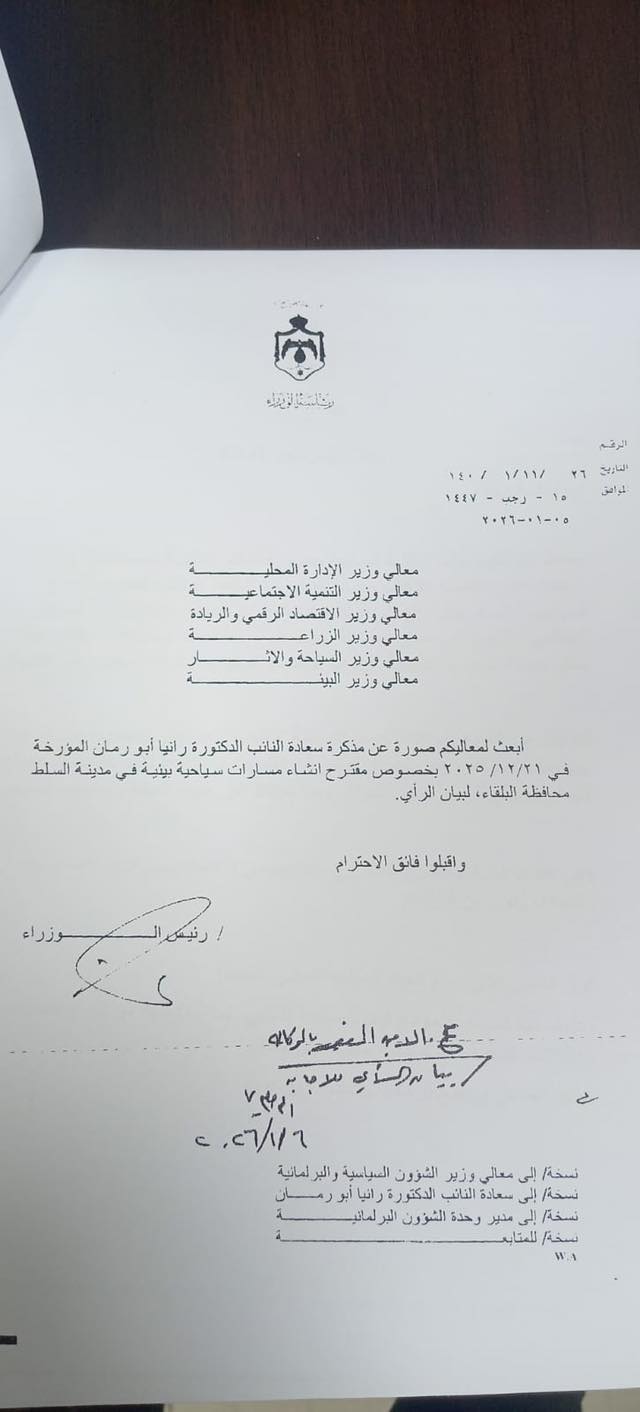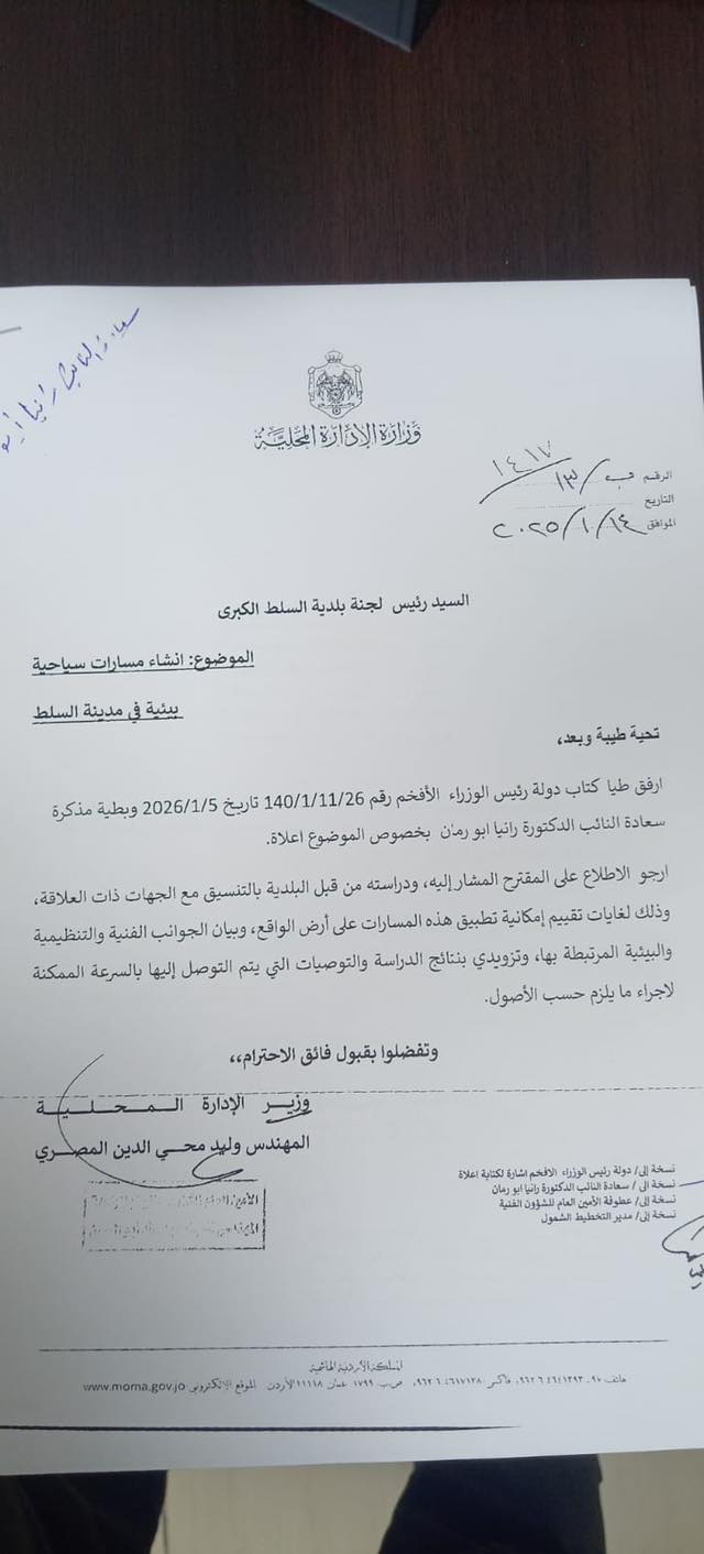 وقد وجّه دولة الرئيس، مشكورًا، مذكرتي إلى جميع الوزارات المعنية، ومنها وزارة الإدارة المحلية والبلديات، التي قامت بدورها بتوجيه كتاب إلى رئيس بلدية السلط الكبرى لإجراء الدراسات اللازمة تمهيدًا لتنفيذ المشروع على أسس علمية وتنموية مستدامة