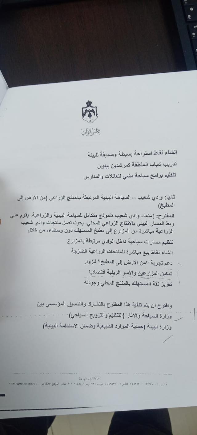ويشمل المقترح إشراك عدد من الوزارات المعنية، وهي وزارة البيئة، ووزارة الاقتصاد الرقمي، ووزارة الإدارة المحلية، ووزارة الزراعة، ووزارة السياحة، إلى جانب البلديات، على أن يكون المجتمع المحلي شريكًا أساسيًا ومحورًا رئيسيًا في التخطيط والتنفيذ والإدارة، بما يعزز ملكية المشروع واستدامته.