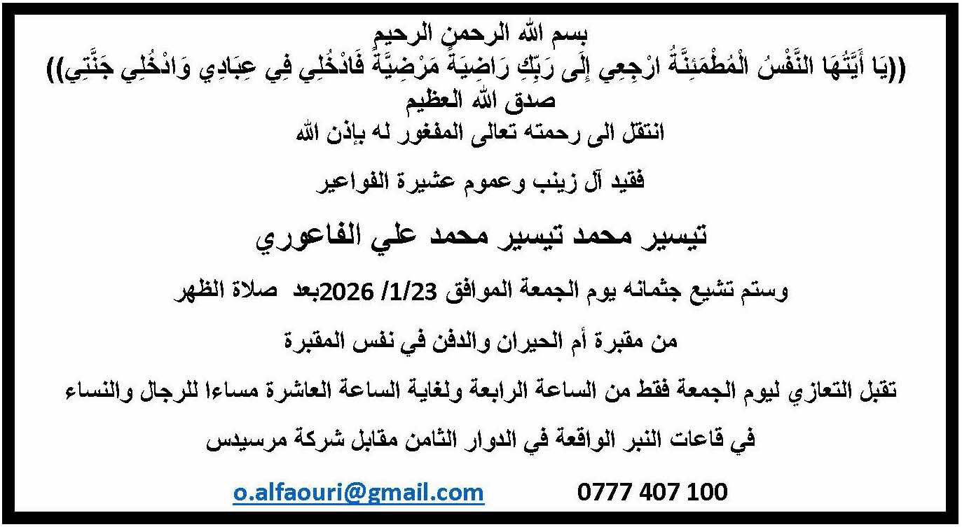 البلقاء اليوم - بقلوبٍ مؤمنة بقضاء الله وقدره، ننعى وفاة