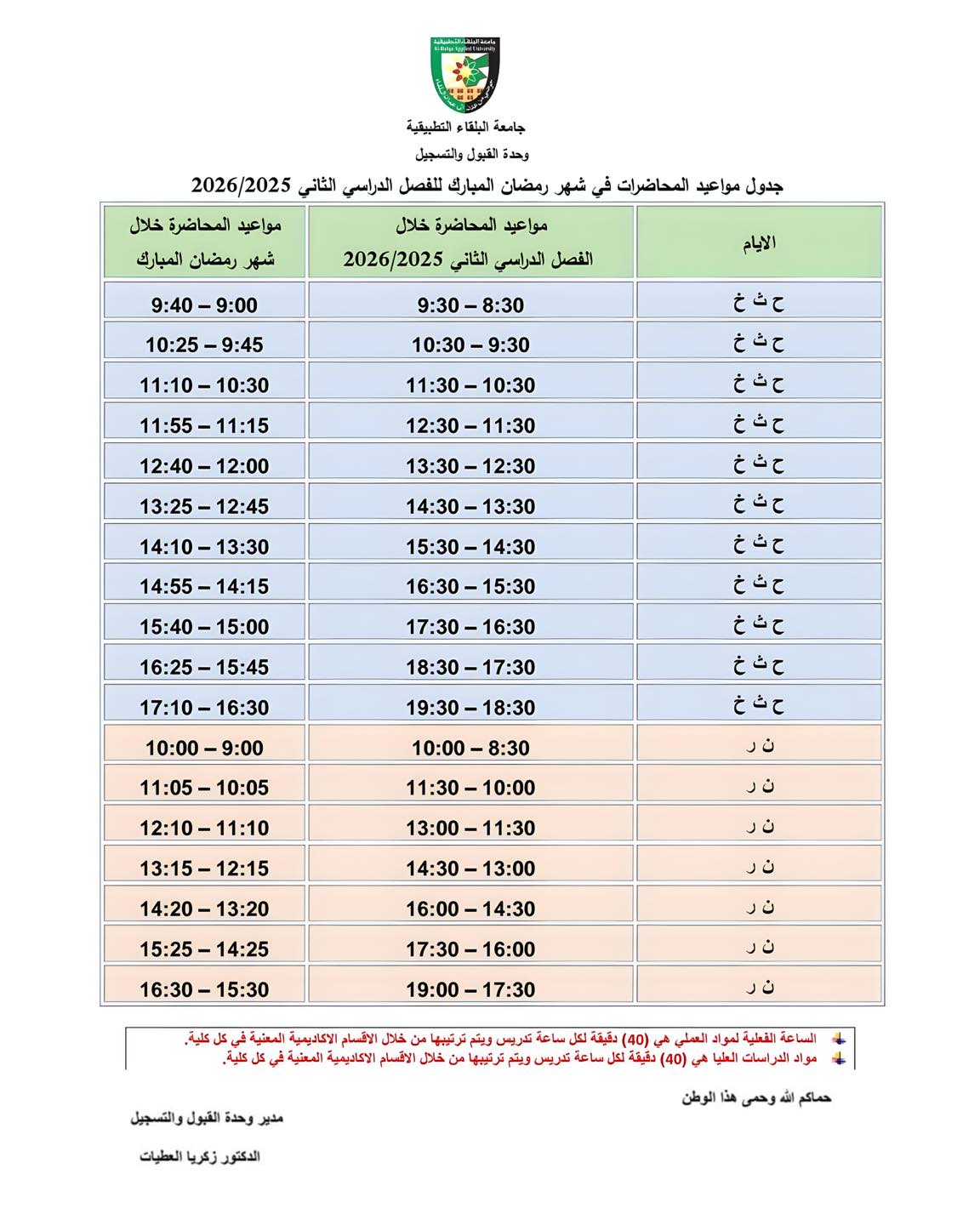 البلقاء اليوم - اعلان جدول مواعيد المحاضرات خلال شهر رمضان المبارك لعام 2026