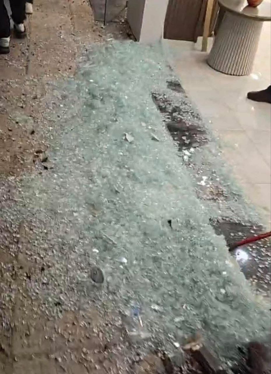 البلقاء اليوم - أضرار مادية لحقت بأحد المحال التجارية في شارع الهاشمي وسط اربد جراء سقوط شظايا المقذوف الجوي