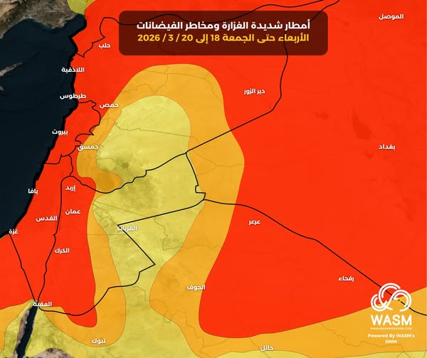 البلقاء اليوم - منشور WASM وسم يحذّر من أمطار شديدة الغزارة ورعدية بدءًا من مساء الأربعاء مع مخاطر مرتفعة جدًا للفيضانات والسيول وفق خارطة تنبيه تمتد من الأربعاء وحتى الجمعة