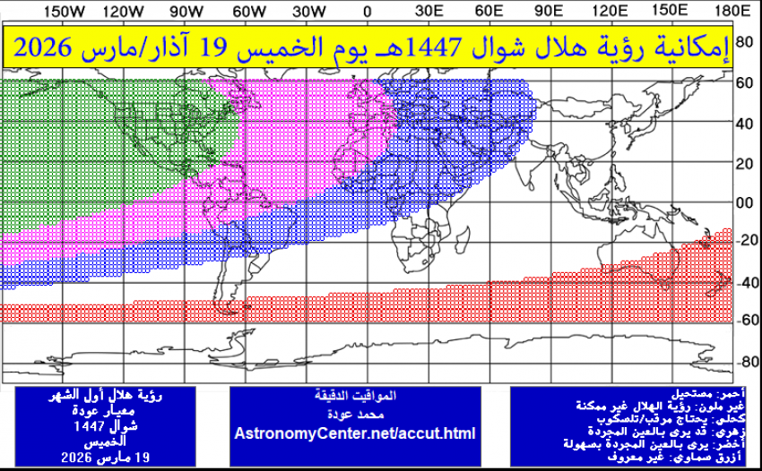 وبالنسبة لوضع الهلال يوم الخميس 19 مارس في بعض المدن العالمية، فإن الحسابات السطحية للهلال وقت غروب الشمس كما يلي:
