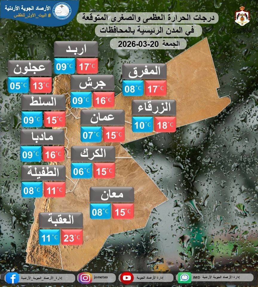 تبقى المملكة يوم الجمعة (أول أيام عيد الفطر السعيد) تحت تاثير منخفض جوي يجلب أجواءً باردة وماطرة على فترات، حيث تهطل الأمطار في شمال ووسط المملكة وقد تكون غزيرة أحياناً ومصحوبة بالرعد وتساقط البرد، مع امتداد زخات خفيفة إلى أجزاء من المناطق الشرقية والجنوبية الغربية، وتضعف الهطولات مؤقتاً خلال ساعات النهار لتعود ليلاً بشكل تدريجي.