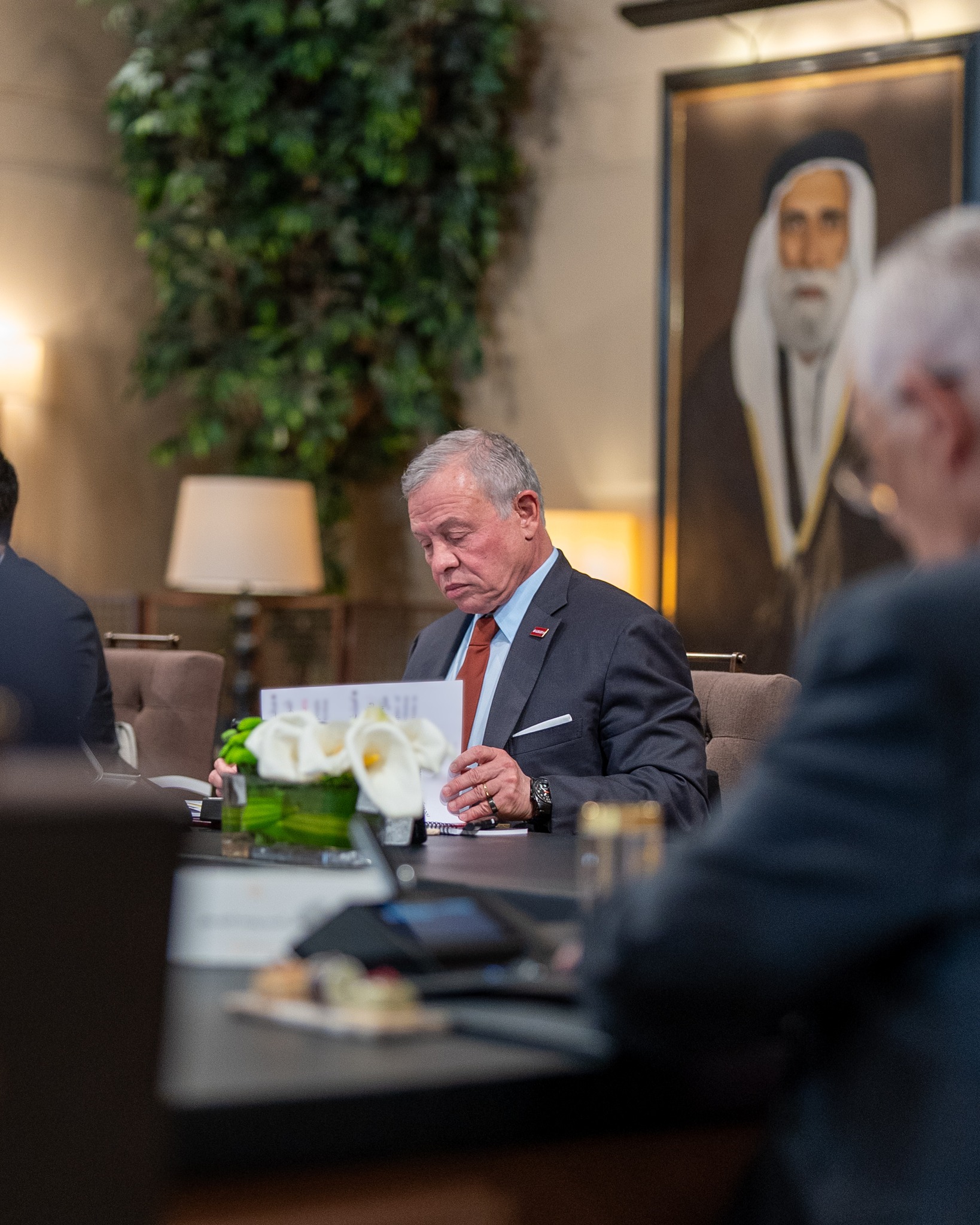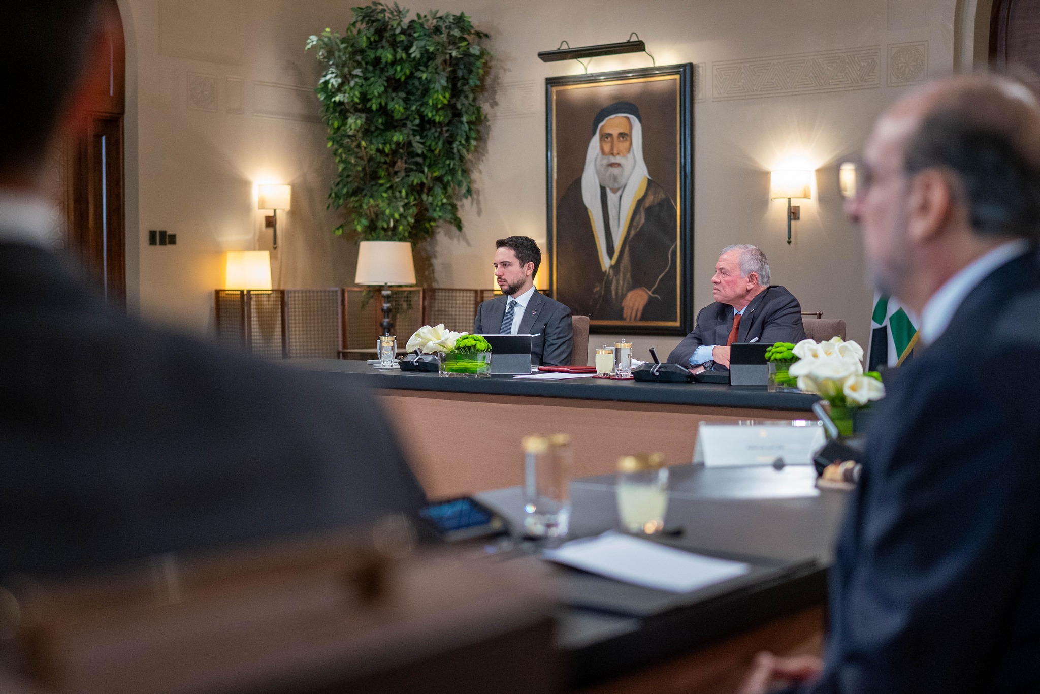 His Majesty King Abdullah II meets with members of the specialised committee to develop the judiciary and receives its recommendations, during a meeting attended by His Royal Highness Crown Prince Al Hussein at Al Husseiniya Palace.