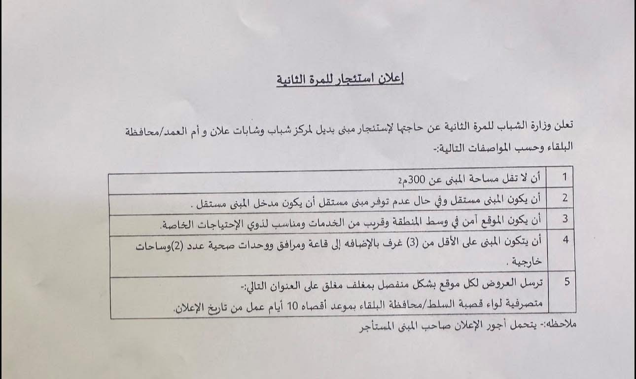 تعلن وزارة الشباب / مديرية شباب محافظة البلقاء عن حاجتها لاستئجار مبنى بديل لمركز شباب وشابات علان وام العمد ، ضمن منطقة قضاء زي ، وذلك وفق المواصفات والشروط التالية :