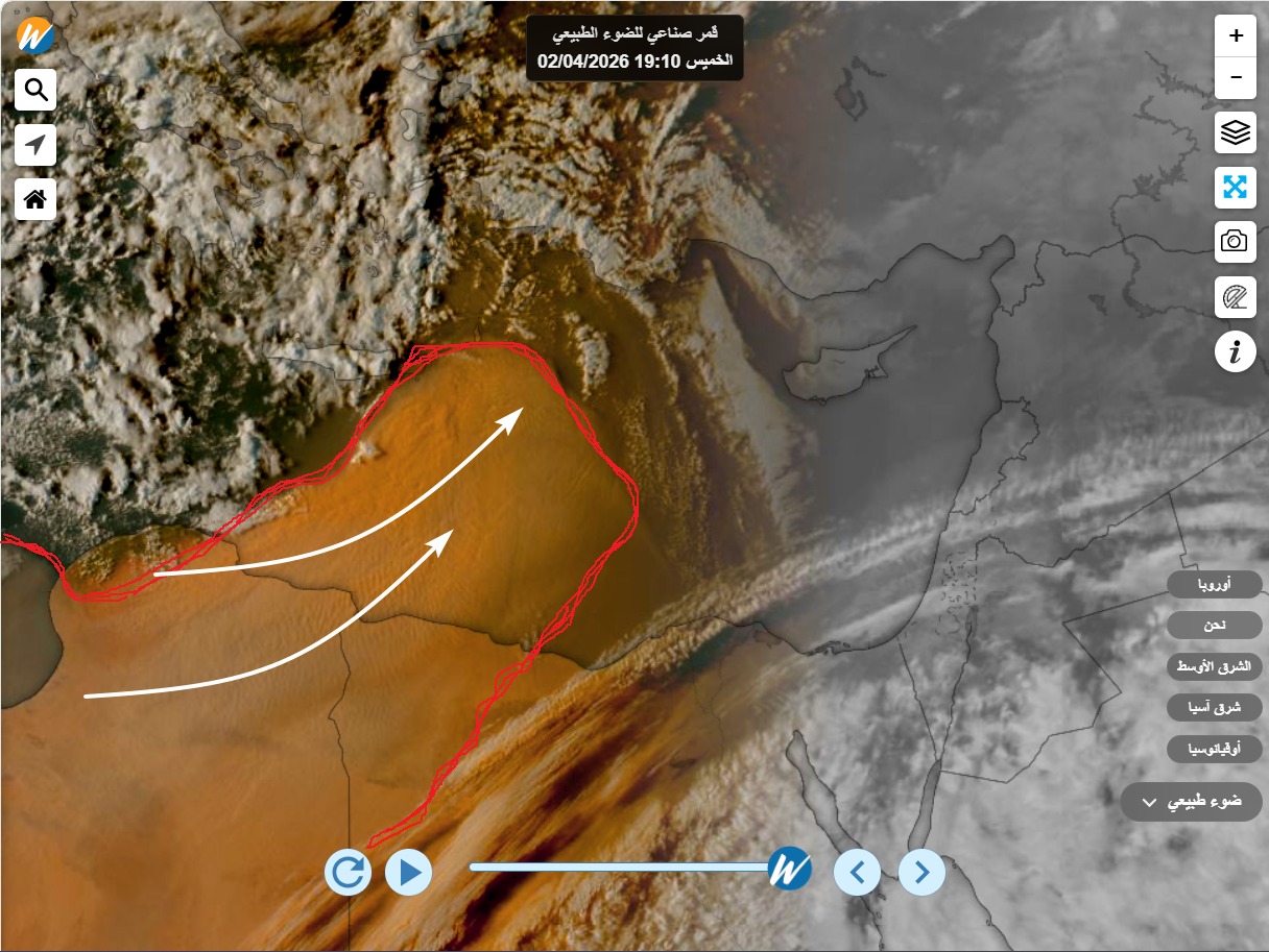 ️ ورصد فريق توقعات الطقس في بلاد الشام عند ساعات الغروب عاصفة رملية اخرى كثيفة جداً، قد انطلقت من الاراضي الليبية باتجاه البحر الابيض المُتوسط، وهي تتجه بشكل مُباشر نحونا هذه الليلة.