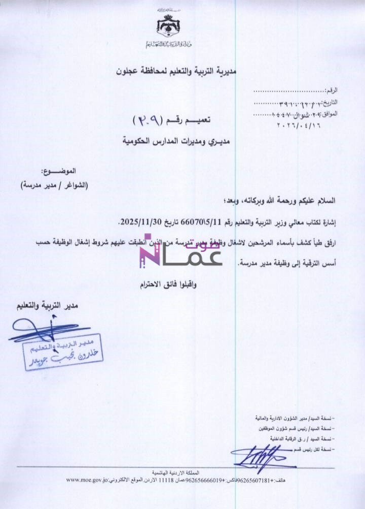 وبحسب التعميم رقم (29)، فان الاسماء المنشورة تشمل المرشحين الذين انطبقت عليهم شروط اشغال الوظيفة وفق اسس الترقية المعتمدة، وذلك استنادا لكتاب وزير التربية والتعليم رقم 6607015/11/11 تاريخ 30/11/2025.