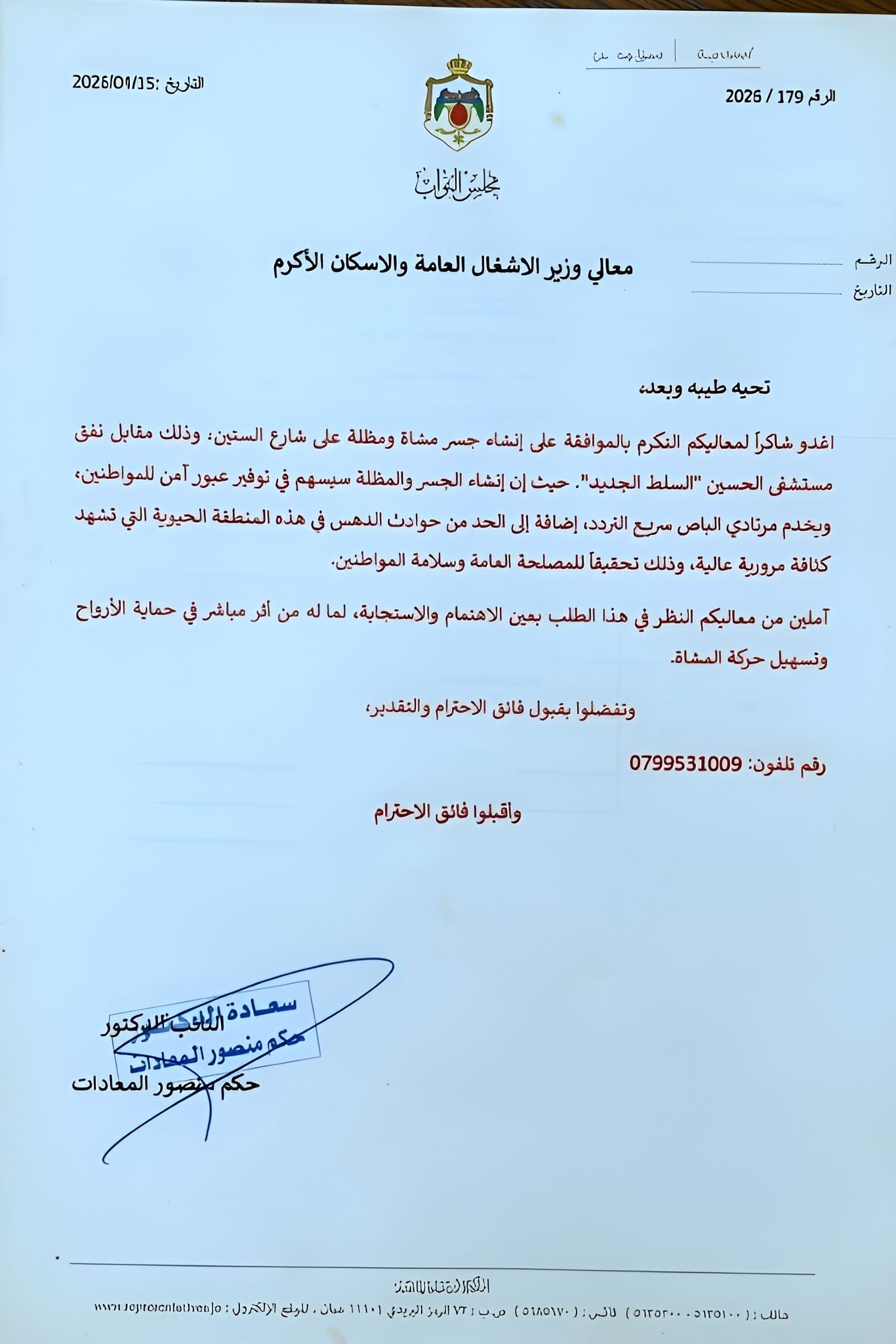 وقد أسفرت هذه الجهود عن الاتفاق على تنفيذ عدد من المشاريع المهمة على شارع الستين في مدينة السلط، من أبرزها إنشاء جسر مشاة مقابل مستشفى السلط، بهدف الحد من مخاطر عبور الطلبة والمراجعين، خصوصًا في منطقة تشهد كثافة مرورية عالية، ما يشكل خطوة نوعية لتعزيز عناصر السلامة العامة.