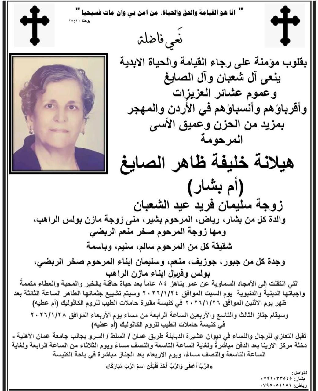 إنتقلت من رحمة الله الى رحمة الله المرحومة #بثينة #ابراهيم #ياسين #خليفة #النسور وسيتم تشييع جثمانها الطاهر هذا اليوم الموافق 24/01/2026 بعد صلاة...