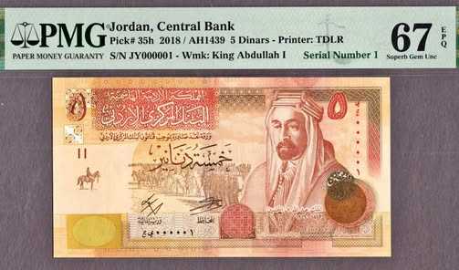 شركة متخصصة تطرح ورقة نقدية أردنية من فئة 5 دنانير إصدار 2018 برقم تسلسلي 000001 وتصنيف PMG 67 EPQ للبيع بسعر 75 ألف دولار